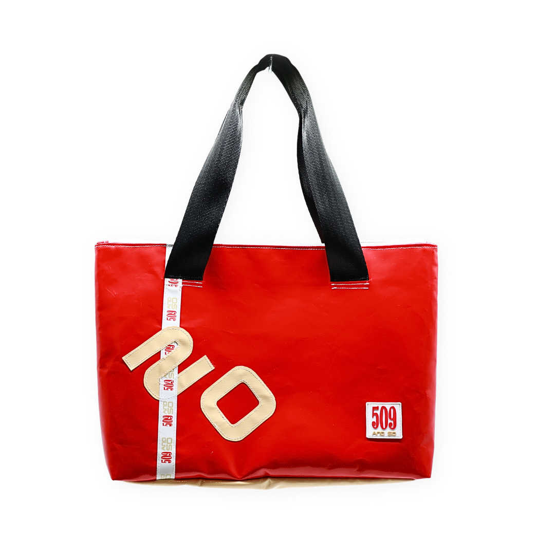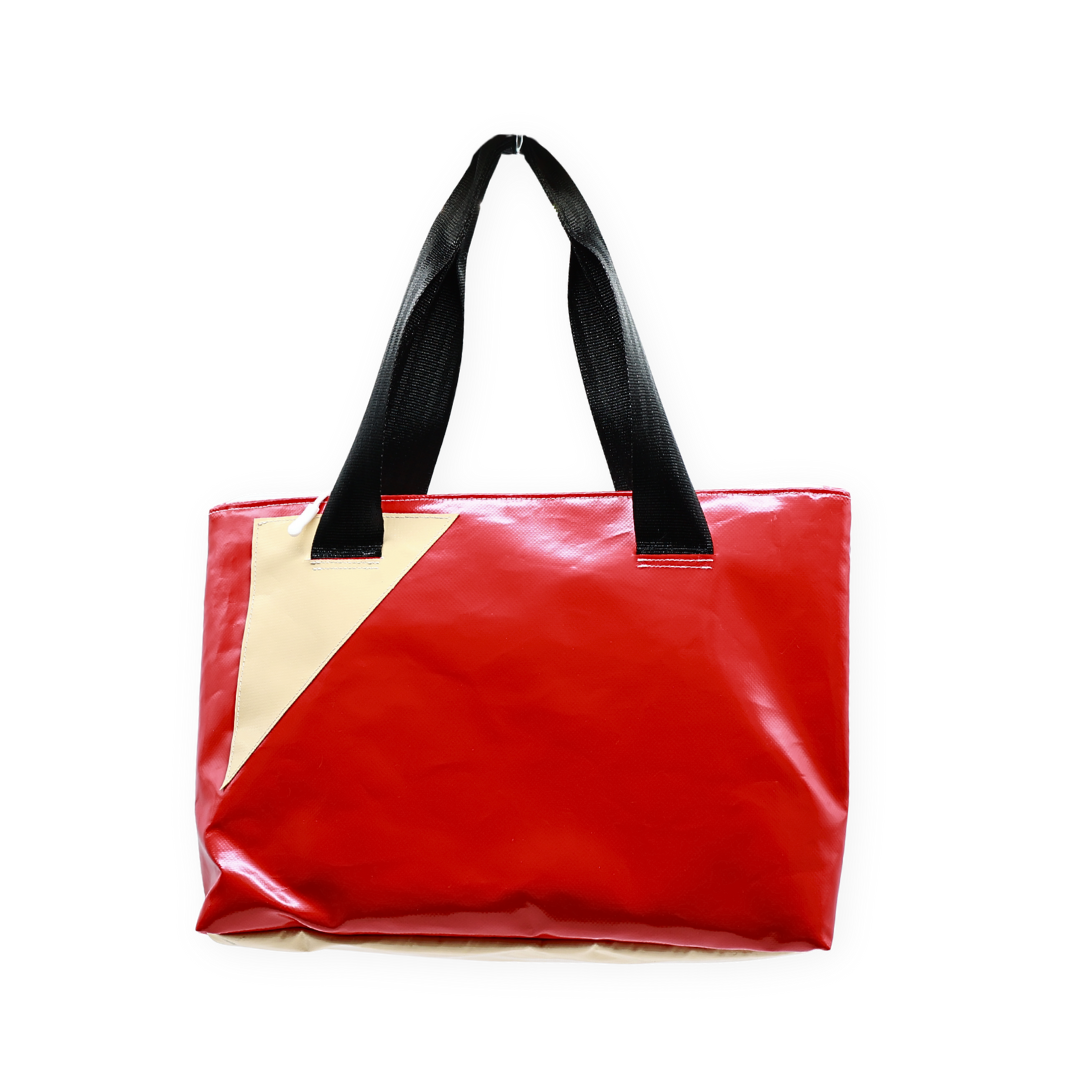 Ogni pezzo è unico, realizzato con materiali recuperati da teli pubblicitari e coperture industriali, trasformati in accessori dal carattere inconfondibile. Dotata di ampio spazio interno per contenere tutto il necessario e comode maniglie rinforzate, la borsa è pensata per chi cerca un prodotto eco-friendly senza rinunciare a stile e funzionalità.