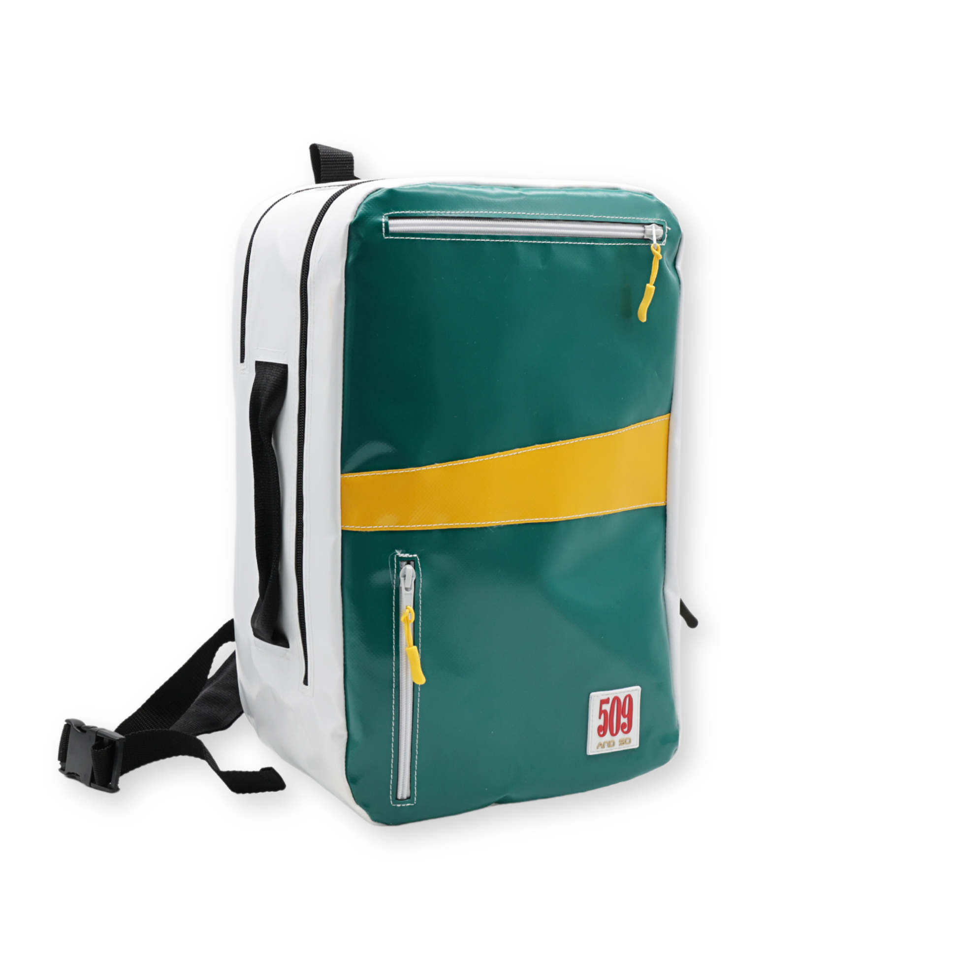 Lo zaino da viaggio modello RELEAF realizzato con telo in pvc è un prodotto unico, adatto a chi si sposta per lavoro o per studio ed è sempre in movimento.