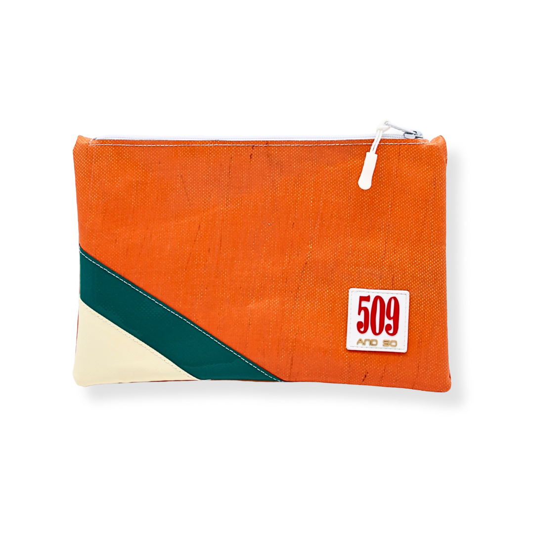 Perfetta da sola come mini clutch o da inserire in una borsa più grande, è resistente, impermeabile e facile da pulire. Ogni pezzo è unico grazie all’uso di materiali riciclati, con leggere variazioni di colore o texture che rendono ogni pochette diversa dalle altre.