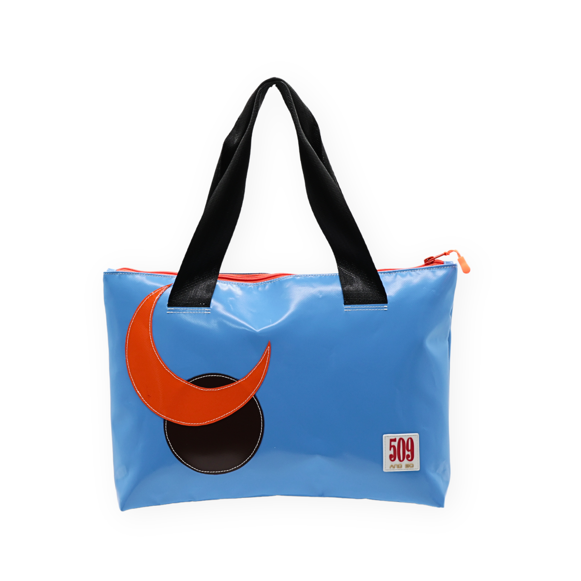 Ogni pezzo è unico, realizzato con materiali recuperati da teli pubblicitari e coperture industriali, trasformati in accessori dal carattere inconfondibile. Dotata di ampio spazio interno per contenere tutto il necessario e comode maniglie rinforzate, la borsa è pensata per chi cerca un prodotto eco-friendly senza rinunciare a stile e funzionalità.